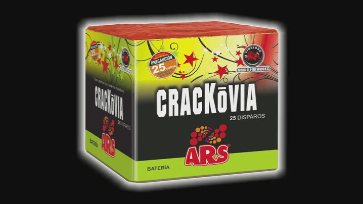 25 disparos. Cola roja con cracker; verde con apertura verde; rojo con apertura roja; verde con peonía verde; rojo con peonía roja.